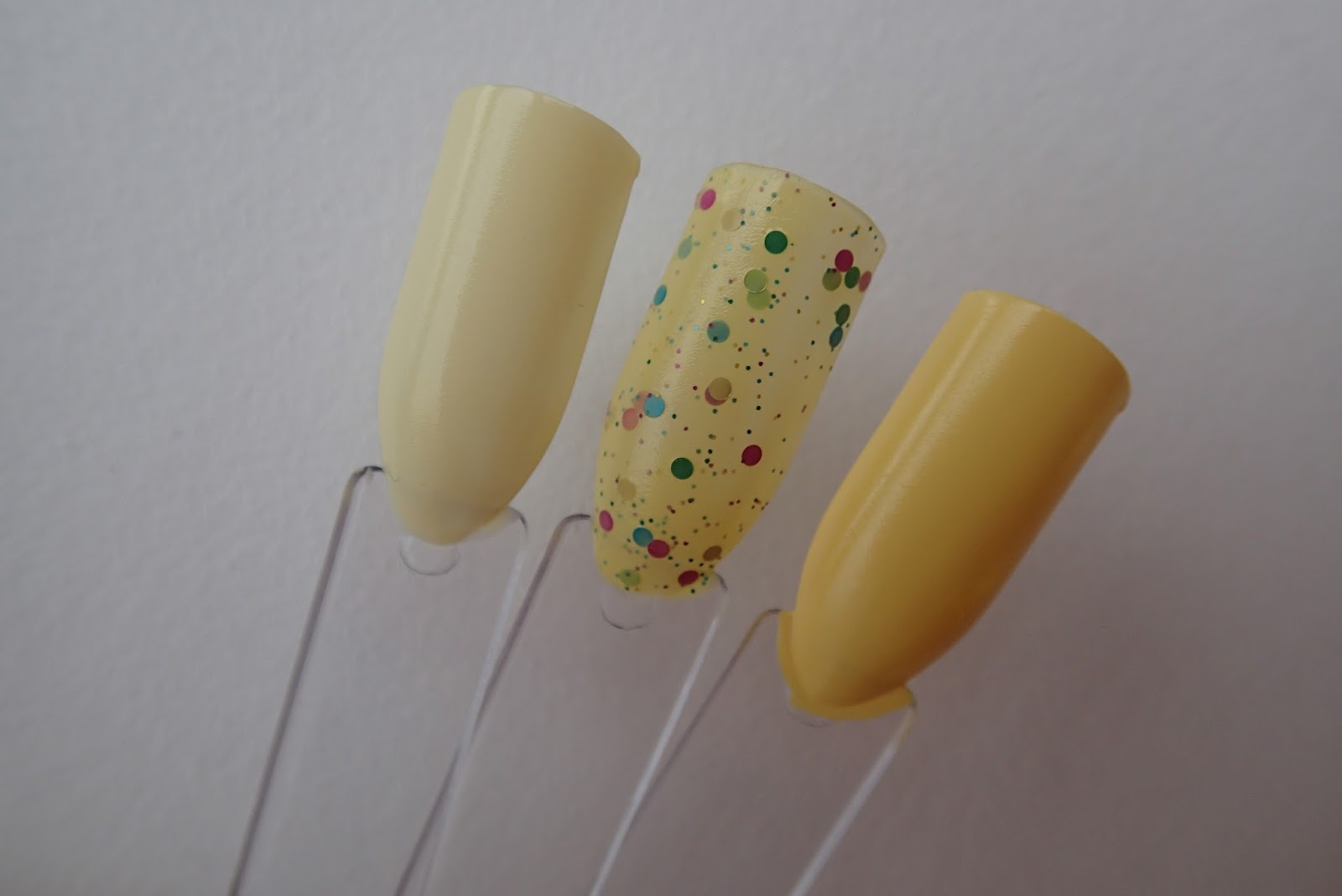 Конечно, сравнивать этот лак с какими-либо другими в целом смысла не имеет, он единственный и неповторимый. А вот сравнить цвет базы вполне можно. Из наиболее близких у меня есть Models Own Banana split (слева) и Orly Lemonade (справа). Models Own чуть светлее, а Orly - значительно темнее и даже чуть более оранжевый (вот это было удивление, что Lemonade может быть темнее и теплее какого-либо лака).
